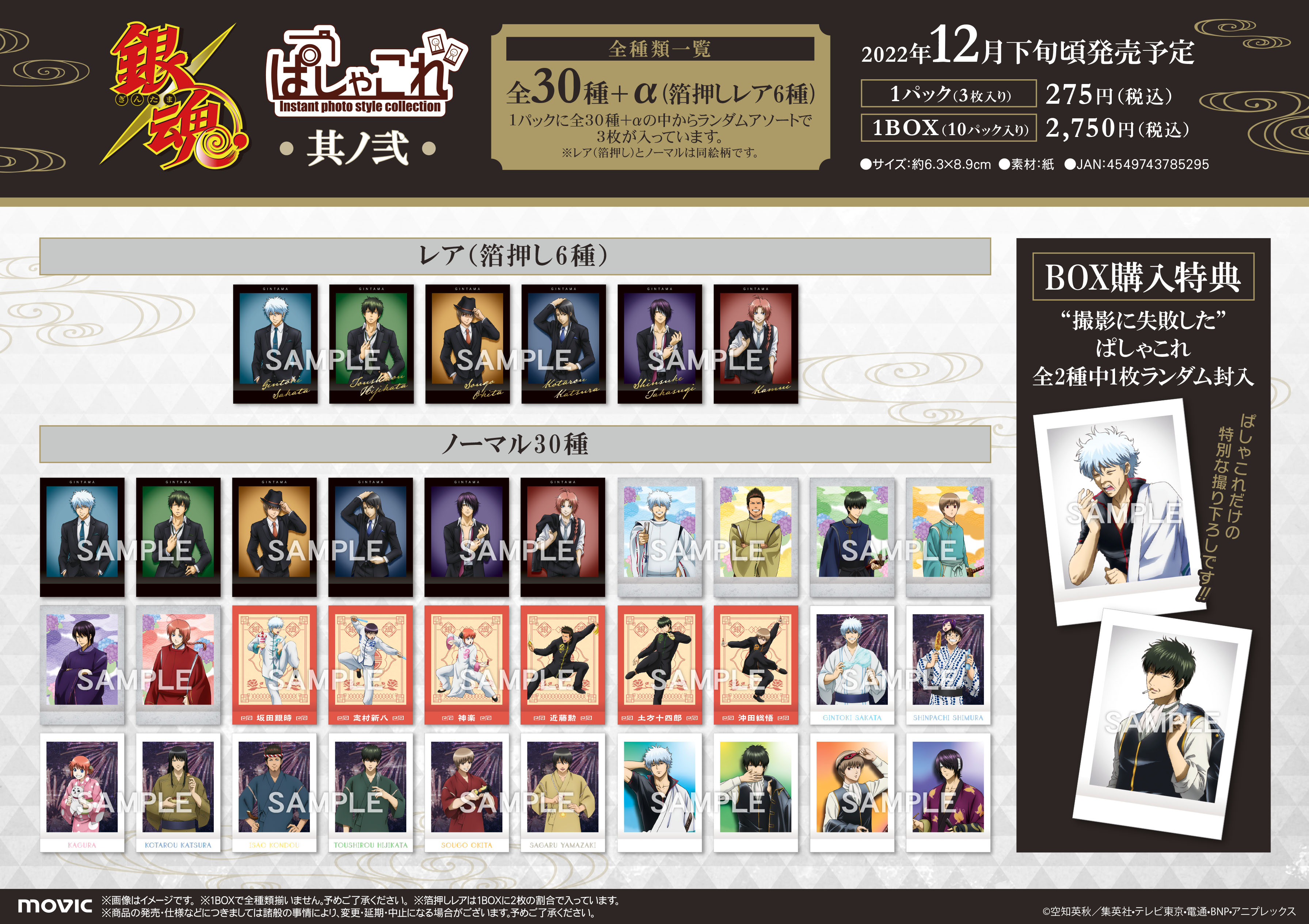 Movic issued an apology with regards to the box cards. Although they had scheduled a special “photoshoot” with the Gintama cast, the box card images were somehow lost, so they used two images that were originally discarded. The rare cards have the same images as 6 of the regular cards.