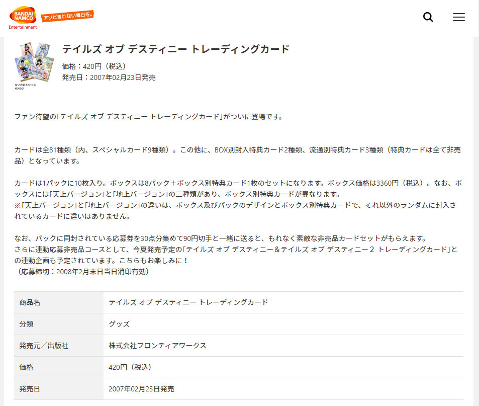 • Set name (JP): テイルズ オブ デスティニー トレーディングカード